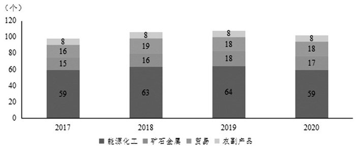 本文以500强榜单为基础,截取近四年榜单数据进行统计分析,旨在对近年来全球大宗商品交易商的发展现状进行整体把握。根据500强企业所属行业分类,炼油、采矿及原油生产、贸易、金属产品等12个行业与大宗商品相关。经统计,2020年的500强企业包含102个交易商,近4年全球累计有118个交易商上榜。