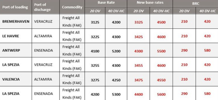 此外,全球第三大集装箱运输公司CMA CGM已从新年度开始,将北欧至加拿大,墨西哥东海岸,美国东,西海岸和墨西哥湾的最新FAK费率引入。