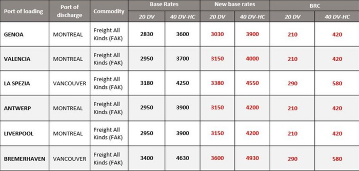 在同一日期,马士基2M联盟的合作伙伴地中海航运公司(MSC)将采用以下从欧洲到加拿大和墨西哥的各种运费(FAK)。