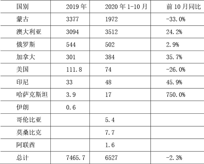 表为2019—2020年中国炼焦煤进口量(单位:万吨)