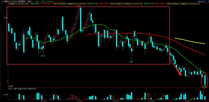 那么造成01合约二者价差跌至极值的原因是什么?目前塑料处于上市后低价位区间,而PVC盘面已升至九年最高水平。特别是11月后PVC01合约呈现明显加速走势,累计上涨1100元,直接水平甚至超过塑料盘面价格。