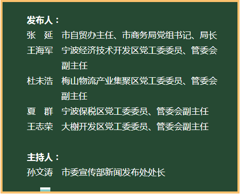 12月9日,宁波市政府新闻办召开新闻发布会。市自贸办主任、市商务局党组书记、局长张延,宁波经济技术开发区党工委委员、管委会副主任王海军,梅山物流产业集聚区党工委委员、管委会副主任杜未浩,宁波保税区党工委委员、管委会副主任夏群,大榭开发区党工委委员、管委会副主任王志荣就中国(浙江)自由贸易试验区宁波片区建设情况进行介绍。