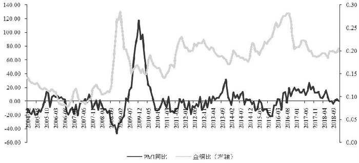本文使用了黄金价格同比与美国制造业PMI订单库存同比做数据相关性分析,结果显示两者的相关系数为0.146,回归拟合优度为2.6%,再通过探究黄金价格与美国短期库存周期的变动,可知黄金价格变动与短期库存周期性波动并无较大明显的关系。不过,值得注意的是在库存周期中黄金和其他大宗商品的比值存在明显的反向关系,如黄金白银比在库存周期中呈现出一定的周期性变化,总体趋势是反向变动关系,这可理解为经济上行时黄金走势不如白银,反之大于白银。这种比值变化在黄金与其他金属比显得尤为明显,如对比黄金与铜的比值可看出2000年以后两者的变动负相关较为强烈,金铜比上升或者下降与美国库存周期走势负相关。