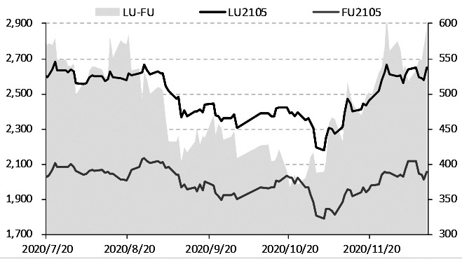 最新公布的EIA周报显示,美国原油库存周度增长1519万桶,但这并没有影响国际油价持续上涨的势头,布伦特原油期货主力合约12月10日突破50美元/桶,升至今年3月以来的最高位。与11月初的低点相比,布伦特原油期货价格反弹超过37%,WTI原油期货价格反弹超过36%。受此影响,燃料油价格大幅反弹,FU2101合约反弹17%,LU2101合约反弹27%,高低硫价差走扩近70%。