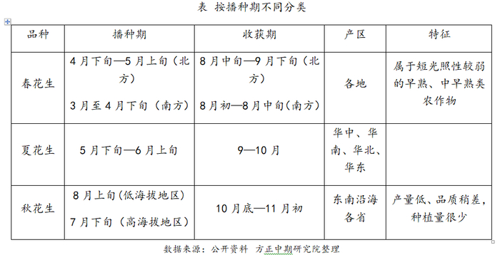 按播种期不同进行分类,可以把花生分为:春花生、夏花生、秋花生。春花生播种在立春至立夏之间播种于全国各地,北方的春花生一般在4月下旬至5月上旬播种,8月中旬至9月下旬收获;南方的春花生一般在3月至4月下旬播种,8月初至8月中旬收获。属于短光照性较弱的早熟、中早熟类农作物。夏花生播种在立夏前后,主要分布在我国华中、华南、华北、华东等地,一般在5月下旬至6月上旬播种,9-10月收获。秋花生主要分布在我国东南沿海各省。海拔低的地区在8月上旬播种,海拔高的地区在7月下旬播种,10月底至11月初收获。秋花生一般是为了来年育种,产量低、品质稍差,种植量很少。