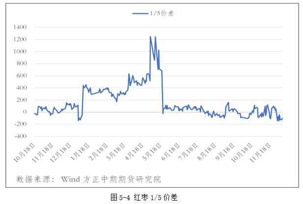 红枣期货价格受红枣种植时间及国内节日消费的影响,走势上有明显的季节性特点,这使得红枣月间套利呈现出一定的规律性。红枣1月合约由于春节前的消费高峰加上应季水果供应量的减少价格会较为坚挺,而进入5月后随着气温的转暖,新鲜水果大量上市需求会有所减弱。红枣1/5价差在季节上的表现应该会呈现出正值的状态,虽然当季红枣在2月后会因为气温的升高需要进入冷库保存,冷库的储存费用会增加一部分成本,但相应的红枣价格也会因需求的减弱而出现下滑。目前盘面红枣1/5价差接近-200的价格,由于本年度红枣库存过高的问题,预期1/5价差很难回到正值以上的位置。
