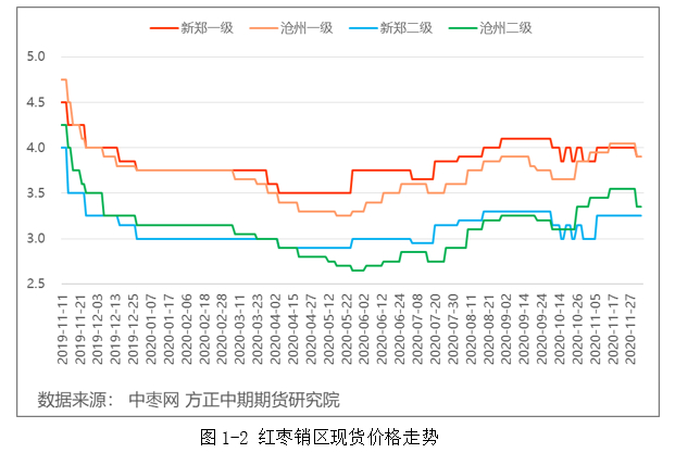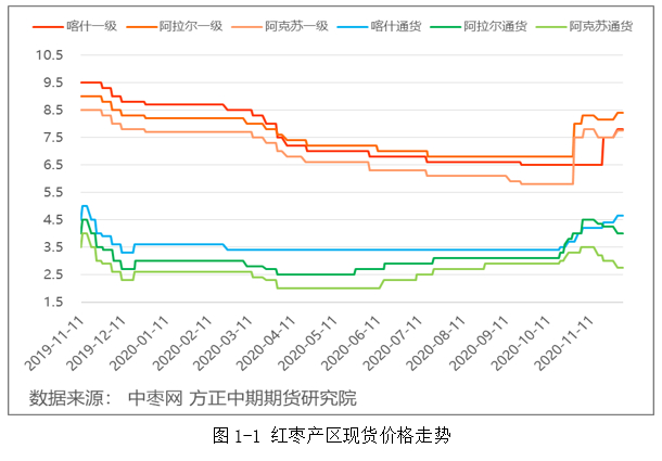 进入11月后,随着新枣的大量上市,产区红枣价格有所上扬,贸易商对好货需求依旧较高,这使得1级好枣的价格上涨幅度明显要高于通货。本轮喀什疫情的暴发对红枣价格并没有带来较大冲击,红枣价格走势依旧平稳,但是由于供需仍处于偏宽松的格局,通货价格显得相对疲软。短期内随着春节消费高峰的来临,红枣现货和盘面价格均有望得到较强的支撑。随着新疆当地托市政策的不断落地,红枣价格在春节前仍有望得到一定的抬升。
