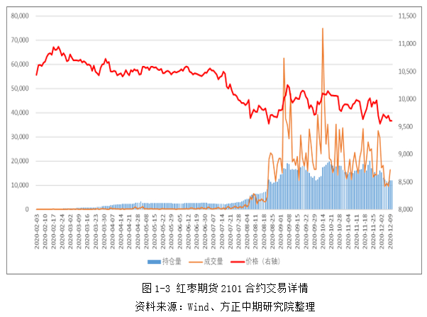 国内红枣期货自上市以来,红枣价格受季节影响出现了较明显的变化。红枣销售旺季通常在每年的春节期间,但是今年由于疫情的影响,在1-2月红枣价格并没有出现明显的上升,但仍然受到了一定的支撑效应,价格是今年内的高点。在春节前后的销售旺季过后,红枣的消费需求也有所下滑,价格开始不断走弱。进入5月后,时令水果大量上市,水果价格也快速下滑,这使得红枣期货盘面价格受到了相应影响,投机氛围的减弱导致了盘面价格的崩塌。每年新枣通常在11月开始下树,今年由于库存红枣压力较大,加上新季红枣产量仍然保持在高位,使得盘面价格在11月短暂上行后再度大幅下滑。