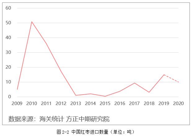 我国红枣消费以国内生产红枣为绝大多数,进口量极少。海关数据显示,近年来我国红枣进口量最高值为2010年的50.81吨,最低为2015年的0.31吨。随着我国红枣产量逐年上升,进口红枣的数量呈现下降趋势。