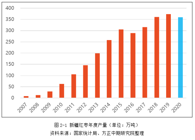 世界红枣看中国,中国红枣看新疆。由于光照时间长、早晚温差大等诸多天然优势,新疆成为了我国目前红枣生产栽培的最佳生态区域之一。新疆红枣产区占到我国红枣总量的80%,是我国红枣的绝对主体。预计灰枣和骏枣340万吨以上(占比85%以上),其他品类预计40万吨,包括哈密大枣、七月鲜等。2005年以前,河北、山东、陕西、山西、河南合并占全国红枣鲜重产量87%,新疆占比不足1%,2005年以来,新疆红枣种植面积快速扩大,2012年成为中国最大的红枣产区。根据新疆统计局的数据显示,从2007至2010年,新疆的红枣种植面积开始大幅上涨,从13.9万公顷扩张至39.7万公顷,2017年达到47.6万公顷。2018年新疆产量达到361.19万吨,占全国产量的49.1%。2019年,新疆红枣产量达到372.76万吨,同比增长3.2%,预计2020年疆红枣产量仍保持在360万吨以上。