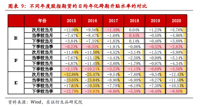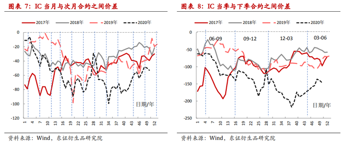 从各年度的日均年化升贴水率来看,2015-2016年因为市场波动较大且股指期货遭遇严格限仓政策,因此贴水结构异常,而2017-2019年年化的跨期升贴水率也是逐年降低,但是今年因为疫情以及宽松刺激政策影响,股市本身波动就比较明显,而股指期货展期价差的波动也比2017-2019年更高了。另外,从下面图表中还可以看出,不管是哪个品种,在绝大多数年份都是下季较当季的年化升贴水率(绝对值)更低,这也解释了为何绝大多数机构在采用股指期货构建策略时,多头偏好持仓当月合约、空头偏好持仓当季合约。