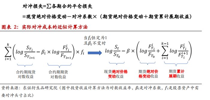 持有股指期货合约而产生的成本,其实是随着负基差收敛的过程而逐步体现出来的,但是展期之所以会产生成本,是因为展期相当于把合约价格又“拉到”一个新的位置后继续因基差收敛而逐步体现损失,反之若基差走阔则意味着获得收益。总的来说,对冲损失(收益)就是现货投资收益率与期货投资收益率(含对冲系数的影响)之差。如图表2所示,以空头套保为例,假设对冲期间经过多次展期,那么总体的对冲损失就等于每个合约在持有期间内的平仓损失累计起来,假设对冲系数不变时则等价于整个对冲期内的现货投资收益率与期货绝对价格变动率、期货累计展期收益率的差。
