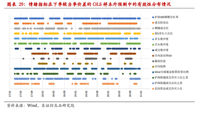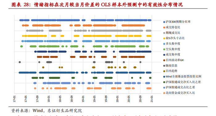 年化展期价差比率剔除了到期时间长度的影响,但发现受指数预期分红率的影响还是很显著,除此之外一些反映市场情绪的指标对升贴水比率也有一定解释。每天更新历史60天各因子对超前1天预测升贴水比率的p值,取其低于10%的因子对下一天进行预测。样本外滚动预测中分红预期有效预测占比超70%且贡献度最高。次月较当月价差预测R2为69%,而下季较当季预测R2为67%。对IH平均预测R2为73%,而IC下季较当季68%,但次月较当月48%。