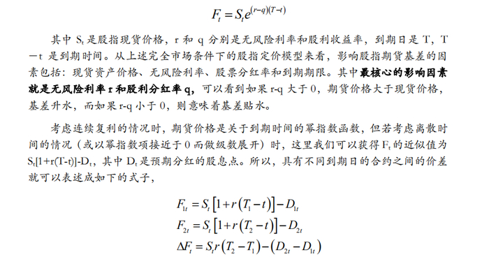 因此如果按照上述完全市场条件下的股指定价模型来看,同一标的物的不同到期日合约之间的价差应该和无风险利率、现货价格、距到期日长度之差、预期股息点数之差有关。把现货价格放到等式左边即表示展期价差相对现货比率,这个是分析展期价差策略收益或分析合约展期成本的主要观察指标,因为合约到期日是固定不变的,因此最主要的影响因素就是预期分红率之差。