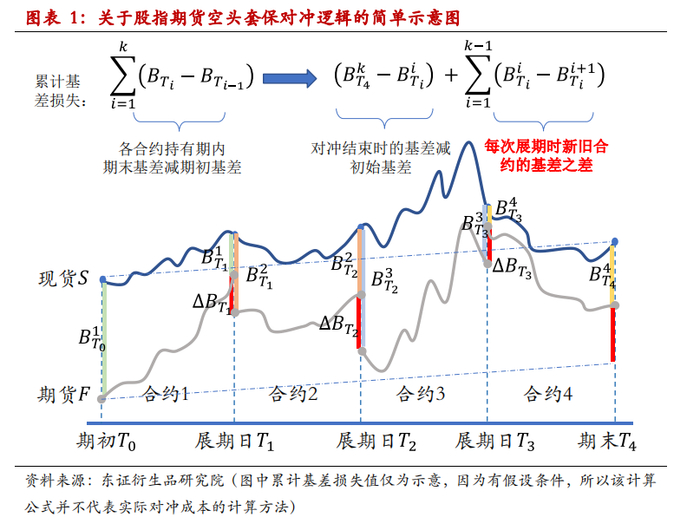 不管是多头套保还是空头套保,除非是非常短期的套保对冲需求,否则当投资期限超过所持合约到期期限时就需要进行展期操作。以空头对冲为例,由于股指期货合约总会因分红、情绪等多种因素而产生贴水的情况,使得空头套保在展期时产生损失。为了更好地理解分析股指展期,我们作了关于股指对冲逻辑的示意图(如下图所示)。为便于理解,假设套保系数固定为1且假设现货与期货对冲数量一致,即忽略因存在期现基差而产生对冲市值的微小差异,这样便于我们通过基差的变动来理解对冲成本。假设𝑇𝑖是每个股指期货合约的展期时点,𝑇0是建仓时点,𝑡为当前时刻,从建仓至今已持有过的合约总共为𝑘个,𝐵𝑖𝑇𝑖是持有第𝑖个合约在展期日𝑇𝑖期时的基差(期货减现货)。