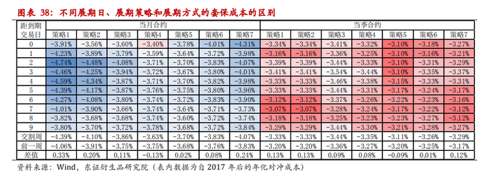 使用股指期货连续合约进行套期保值的成本一般和两个方面有关,一是套保期末基差较初始基差的变化,二是期间套保合约的累计展期价差。当对冲周期较长时,可以通过尽可能地选择与所持旧合约的展期价差较小的新合约进行展期,来实现降低成本的总体目标。对于空头套保而言,展期操作需要先平掉近月空仓,再开远月空仓,相当于做了一次多近月空远月的正向跨期套利,因此在贴水结构下,选择贴水价差相对较小的新合约,而在升水结构下,选择升水价差相对较大的新合约。