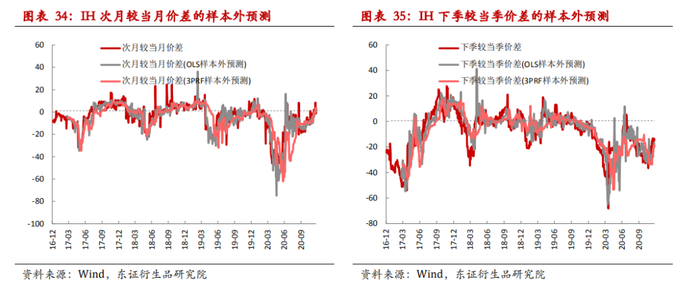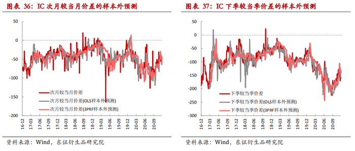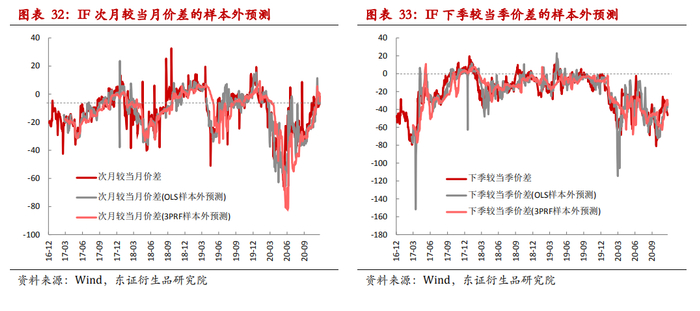 我们从定价实证的角度得到展期价差的区间,由于影响理论价差的关键因素预期分红变化并不大的,所以展期价差的区间的变化也相对较为稳定,虽然大多数时候实际的展期价差在理论的上下边界范围之内运行,但是从定价的角度来看若想对展期价差进行日度级别的预测其实并没有很好的效果。除此之外我们也从影响因素的时序回归的角度得到对展期价差的预测,从OLS预测的结果上来看,对IF次月较当月价差和下季较当季价差的样本外预测R2分别高达68.9%、67.0%。