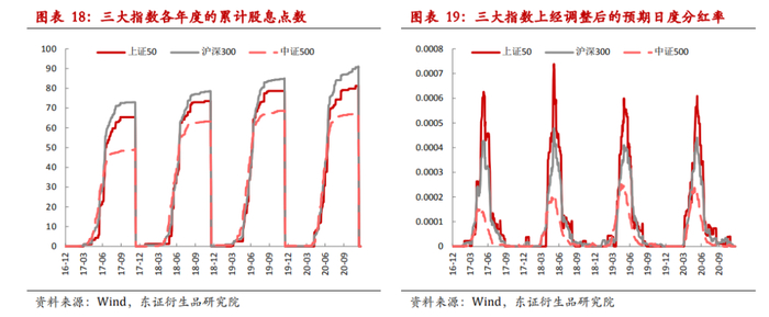股指期货的定价不包含分红,而展期价差的定价中也需要考虑到预期分红的差别,根据前面的定义,这是决定展期价差中枢的最关键因素。截止今年8月底指数成分股年报分红就已基本结束,受疫情对公司业绩的影响,合计起来三大指数2020年整体分红点数略低于去年。从分红的时间上来看,上市公司具体实施分红的日期(除息除权日)大都在每年的5-7月份,主要原因在于大部分上市公司在年报中披露当年度内是否会实施分红。