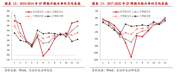 如上图所示,我们分别对升水期(2010-2014年)和贴水期(2017-2020年)的IF的年化跨期升贴水率按月取平均,一方面跨期升贴水率呈现明显的季节性规律,这和期限结构的变化是一致的,受每年4-8月份的分红预期影响,另一方面不管是升水期还是现在的贴水期,下季较当季之间的展期价差是表现最稳定的,因此长期来看采用季月合约进行套保并不断展期是有统计依据的。接下来,我们将会讨论为何远月合约之间的价差会更稳定,以及套保投资者大多采用季月合约套保的最本质的原因。
