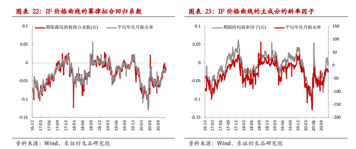 以IF为例,单个情绪指标对升贴水比率的解释度存在差异,其中指数预期分红率显然是对升贴水比率影响最大的,尤其是在2017年股指交易政策逐步恢复常态化以来。对于次月较当月升贴水来说,从每年度内的演变规律来看,它呈现“两头高、中间低”的规律,明显是因收到指数分红预期的影响,而预期分红率与次月较当月升贴水率滞后一期的回归R2为最高的(38.4%),而其他情绪因素反而影响很小。但是对于下季较当季升贴水来说,并不存在“两头高、中间低”的特点,即它的变动在全年范围看是相对平稳的,从单因子的解释度来看,预期分红率几无贡献,而一些和市场投机情绪相关的指标则有一定解释力。