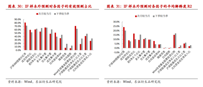 我们用1-预测值与实际值之间的残差平方和/实际值与样本均值的残差平方和来计算样本外的预测R2。从OLS预测的结果上来看,对IF次月较当月价差和下季较当季价差的样本外预测R2分别高达68.9%、67.0%。具体地,从2017年至今对IF次月较当月价差滚动样本外预测中,有效预测时间占比超过60%而且平均解释度R2超过10%的有效因子有沪深300预期分红率、基金股票投资比例、多头持仓集中度以及期现成交比。而对IF下季较当季价差的滚动样本外预测中,有效预测时间占比超过60%而且平均解释度R2超过10%的有效因子,除了沪深300预期分红率、基金股票投资比例、多头持仓集中度、期现成交比之外,还包括前5名净头寸持仓占比。
