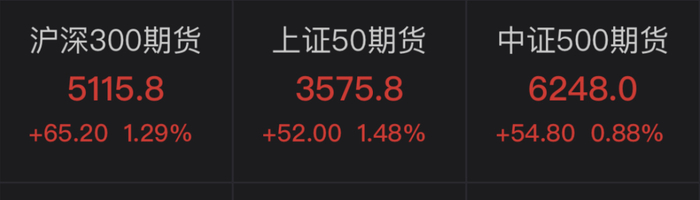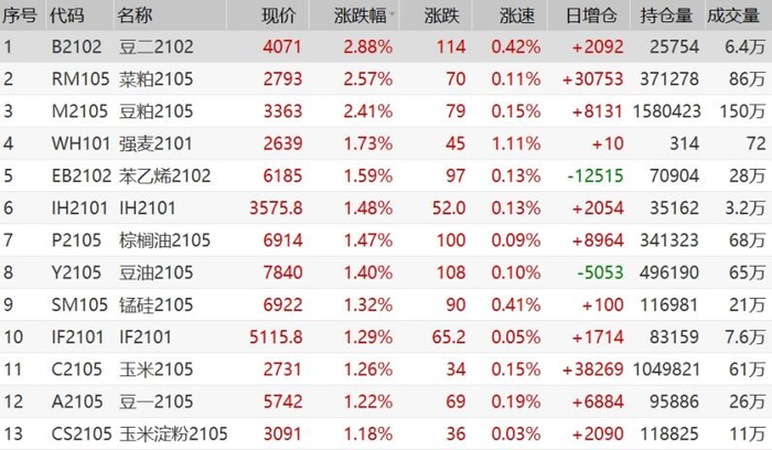 在这样的情况下,股指期货三大主力合约收盘集体上扬。沪深300股指期货主力合约IF2101涨65.2点或1.29%,报5115.8点;上证50股指期货主力合约IH2101涨52.0点或1.48%,报3575.8点;中证500股指期货主力合约IC2101涨54.8点或0.88%,报6248.0点。