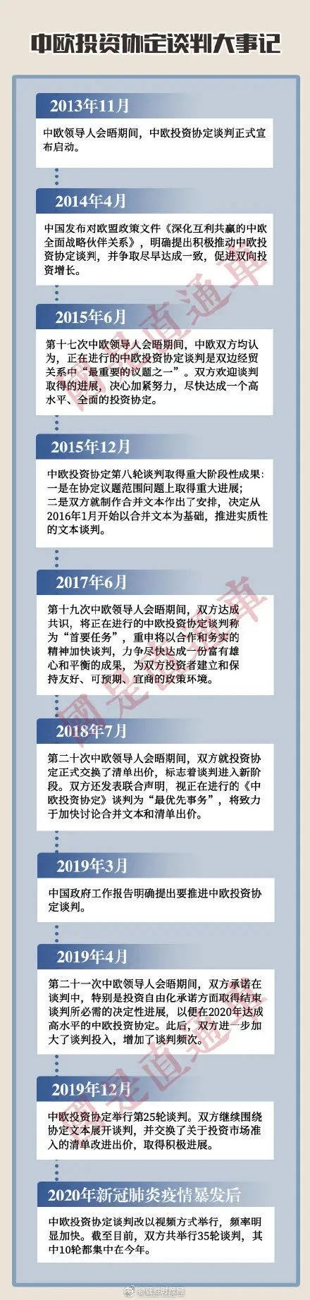 公开资料显示,协定谈判2013年正式启动,至今经历了35轮谈判。目前,欧盟是我国第三大投资来源地。中国超大规模市场吸引力不断增强,截至2020年11月,欧盟27国对华实际投资1179.8亿美元,累计设立投资项目数量超过3.8万个。中国欧盟商会调查显示,疫情没有动摇欧洲企业对华投资信心,89%的受访欧洲企业愿留在中国,2/3的受访欧企将中国列为前3大投资目的地,德国大众、巴斯夫、宝马、安联保险等欧洲企业持续加大在华投资。