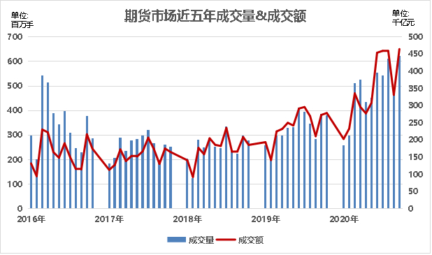 2020年,期货市场资金量和成交持仓量均创历史新高,截至11月底,我国期货市场资金量突破8559.5亿元,同比增长55.2%;1—11月累计成交量、成交额分别达到53.8亿手和382.5万亿元,同比增长50.4%和45.5%。从近五年期货市场的成交情况来看,自2017年以来,期货市场的成交量和成交额稳步扩大,2020年大幅提高。