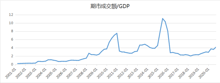 同时,值得一提的是,今年的成交量虽创历史新高,而成交额相对火爆的2015年仍旧是略逊一筹。从期市成交额占GDP的比率来看,2020年相较前几年也是有较大提升的,期货市场的深度日益加深。