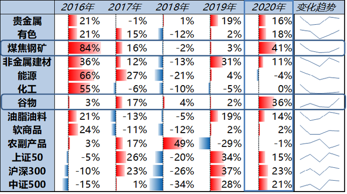分品种来看,2020年,主要商品期货中原油、PTA跌幅最大,可谓是熊大熊二;新上市的LPG年内涨幅高达65%排名居首,疯狂的石头铁矿石的年内涨幅58%,居于次席。