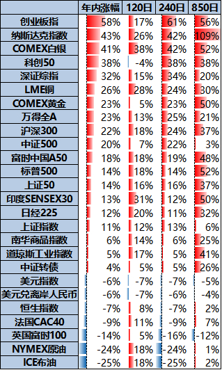 行情火爆:从全球主要资产的表现来看,权益类资产依然是延续近几年的优异表现,以纳斯达克、创业板为代表的股指年内涨幅排名居前。商品价格走势分化,有色贵金属的涨幅较大,原油价格拖累市场,南华商品指数今年表现居中。