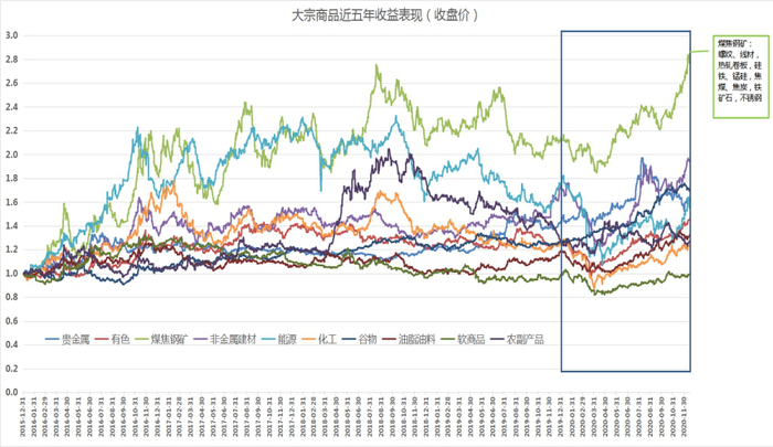总的来看,今年商品期货表现先抑后扬,总的表现不错,但板块间差异大,品种收益很不同。煤焦钢矿可谓是一骑绝尘,全线飙涨,板块年内涨幅最高,为41%;谷物则主要是受益于玉米的优异,总体板块年内涨幅录得36%,屈居次席;能源板块受到原油价格大跌的拖累,排名垫底,年内涨幅收跌4%;能化品种则表现各异,涨跌互现相互抵消,最终收平。