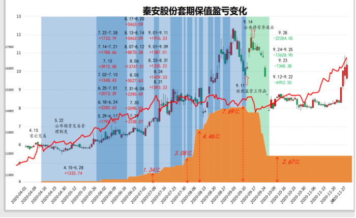 秦安期神:2020年5月至9月,秦安股份陆续发出21份公告,公告中披露的期货交易平仓全部处于盈利状态,累计收益一度高达7.69亿元。有关秦安股份“炒期货”的消息,一度登上行业热搜,成为年内名副其实的最出名的“期货投资者”。