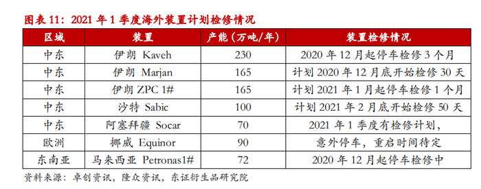 2.4、2021年1季度中东甲醇装置停车检修较多