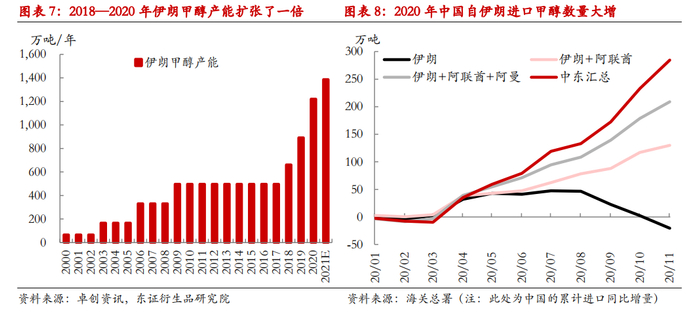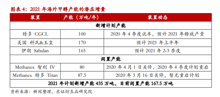 2021年海外新增扩能计划主要是3套装置,分别是特立尼达与多巴哥的100万吨、美国的170万吨以及伊朗的165万吨,合计拟扩能435万吨。此外,为对冲疫情期间需求萎缩而主动关停的两套南美装置暂时也是闲置状态,理论上海外甲醇产能潜在增量约600万吨左右,相当于海外有效产能还有10%左右的增长潜力。不过新增产能释放节奏以及产能利用率可能有非常大的变数。我们认为关键变量在于南美以及伊朗。
