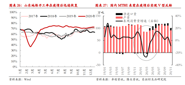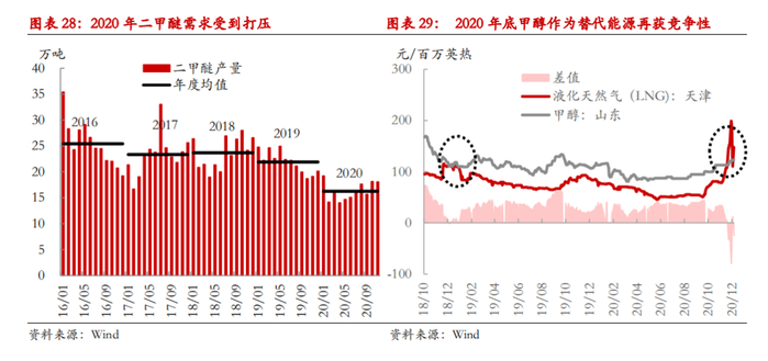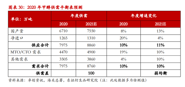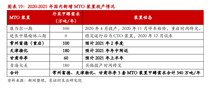 2021年国内供应端的重点在于神华榆林与中煤图克两套大型装置计划投产,商品化供应量料将增加,内地供需格局也将重构,不过我们对需求端同样持乐观预期,MTO领域仍有新装置待投产、传统化工需求有望实现同比正增长、油品相关需求将受益于成品油消费复苏、能源价格走高有助于提振醇醚燃料需求,由此多路径的需求增长有望形成合力。