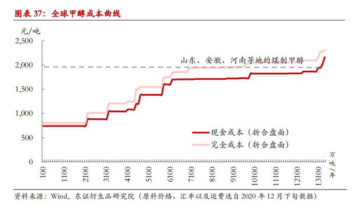 从全球范围来看,中国内地煤制甲醇、中国天然气制甲醇以及南美地区的甲醇装置处于成本曲线偏高的位置。