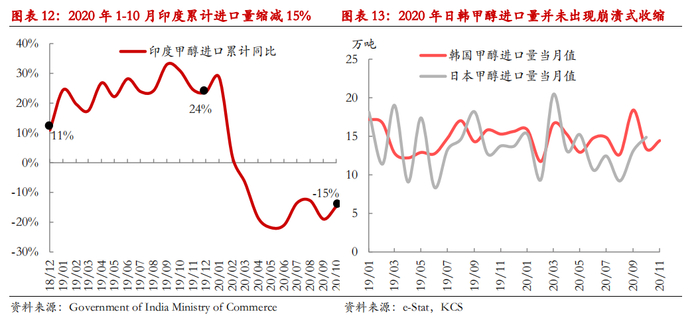 在以往年份,海外甲醇需求基本维持稳态,全球甲醇市场的变局主要是全球增量供应与中国增量需求的较量。然而2020年的新冠疫情打破了这一常态。对于海外甲醇需求变化市场上缺乏直接的观察指标,在此我们借助主要需求国的进口数据来简单估测疫情的影响程度。2020年1-10月,韩国、日本、美国以及印度的累计进口量分别同比变化0%、-6%、-10.8%以及-15%。韩国、日本以及印度基本是单纯的进口国,从其进口缩减可以看出需求端明显出现减量。分区域来看,欧美以及印度等地的需求缩减程度要明显大于亚太区域。根据疫情严重程度推断,欧洲区域的需求缩减幅度大概率与美国和印度更为接近,由此粗略估算出2020年海外甲醇需求至少缩减150万吨以上。