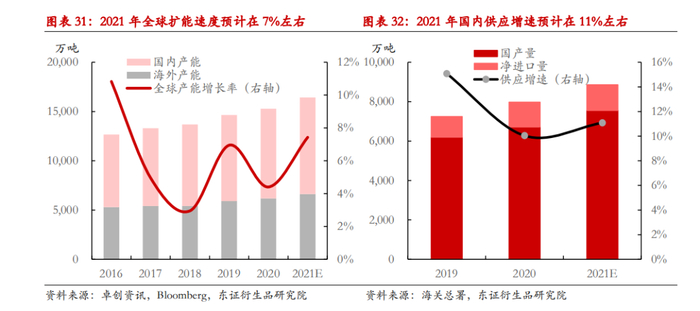 基于以上分析,我们倾向于认为当前的盈利环境支持部分南美供应回归,但很可能并不会立即恢复至2019年的高位水平。潜在的供应回归既包括确定性较大的智利80万吨装置重启,也包括南美区域产能利用率的整体提升,粗略预估南美区域2021年有50-100万吨的弹性增量供应空间。