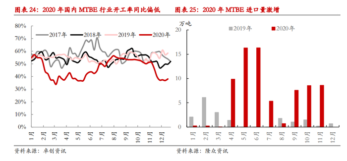 疫情影响之下成品油消费受到制约,国内MTBE行业也经历了较为艰难的时刻。由于成品油地板价机制的存在,低油价刺激国内炼厂积极生产。截至4季度,国内MTBE需求几乎恢复至疫情前水平,只是国内MTBE生产端的恢复明显不及需求端,MTBE行业开工率与地方炼厂开工率出现背离,这种差异出现的原因在于大量进口MTBE涌入国内,从而压缩了国产货源的生存空间。