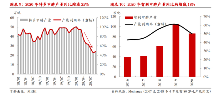 根据我们的粗略测算,2020年特立尼达与多巴哥的甲醇产量约为425万吨,同比缩减25%,全年平均产能利用率仅在7成左右;智利2020年的甲醇产量在80-90万吨左右,同比缩减18%。南美地区2季度以来的主动收缩供应以及3季度的检修极大的缓解了年内全球甲醇市场的供应压力。