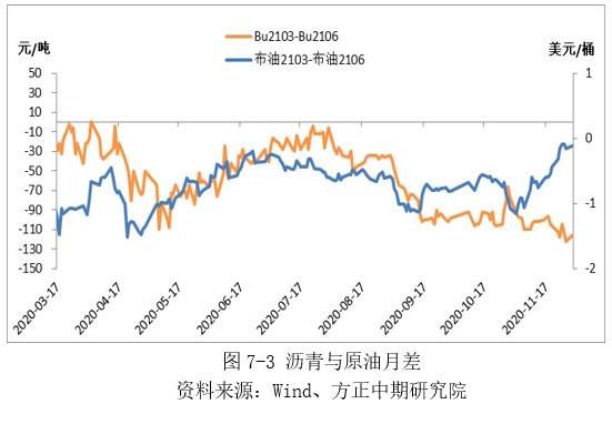 跨期套利方面,沥青月差与原油月差存在较强的关联性,走势基本保持一致,但在2020年底,由于沥青与原油各自基本面出现差异,使得两者月差走势出现背离。从原油月差的角度来看,2021年有一定走强的预期,从沥青的月差来看,暂看不出明显的规律性,因此可根据原油月差对沥青月差变化的带动来做相应的操作。