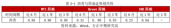 石油沥青是原油蒸馏后的残渣,是原油加工的副产品,原油价格的变化对于沥青价格走势影响较大。国内石油沥青期货价格走势与全球三大原油期货价格均有着较强相关性,根据我们的统计,近1年沥青与SC原油、Brent原油、WTI原油的相关性分别在0.84、0.9和0.9,但短期相关性差异较大。而通过观察我们发现,国内石油沥青期货价格走势受成本端走势变化的影响越来越明显,中长期单边波动基本会以跟随原油波动,短线波动受影响因素较多,与原油相关性也表现出一定的不稳定性。