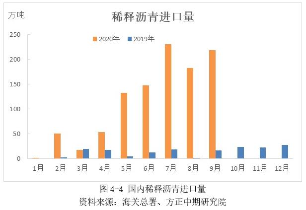 为应对马瑞油供应的下降,国内沥青炼厂也在积极寻找替代原料,包括马来西亚转口的马混、冷湖、稀释沥青以及中东地区部分重质原油均成为主要的沥青替代原料,且供应相对稳定。2020年国内稀释沥青进口量大幅增长,海关的资料显示,1-9月份稀释沥青进口量累计达到1036.65万吨,而2019年同期进口量仅为161.35万吨,同比增长了543%。目前来看,虽然马瑞油供应锐减,但国内沥青生产替代原料充足,稀释沥青进口大幅增长在一定程度上补充了沥青原料的供给,使得国内沥青供应整体保持稳定。2020年底有消息称中石油恢复进口委内瑞拉原油,但尚不明确能否恢复如前,排除马瑞油供给的不确定性来看,国内沥青替代原料供应不会出现大问题,这在一定程度上保证了国内沥青的供应。