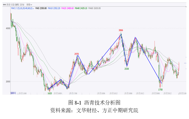 沥青期货价格自2016年初启动上涨行情,至2018年10月份达到3866的高点,此后运行重心逐步下移,最低跌至1758,到2020年4月初,基本完成了完整的8浪结构,并启动了新一轮的上涨行情,目前仍处在上行的初期。