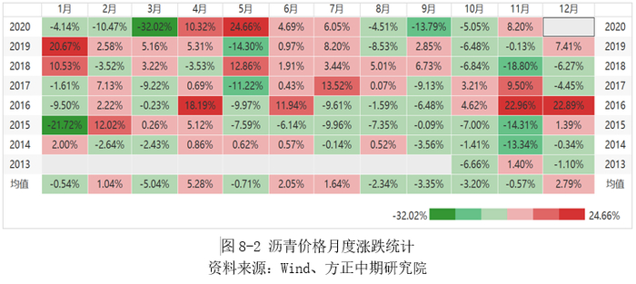 沥青的现货端消费具有一定的季节性特点,8-11月份一般为沥青的消费旺季,需求往往会达到年内高峰,12-2月份为沥青的消费淡季,沥青需求会大幅萎缩,但我们通过对沥青期货价格季节性走势进行分析后发现,沥青价格走势没有表现出明显的季节性特点,在9-10月份现货消费旺季反而下跌的概率较大,我们认为这与沥青期货走势受成本端走势影响更为明显有关。由于沥青是炼厂常减压装置下的直接产品,因此沥青与原油走势之间有着较强的相关性,长期相关系数能达到0.8以上,因此就长期趋势来说,相对于沥青供需面,成本端的影响占比似乎更大。近几年,国际宏观局势动荡,原油作为大宗商品的龙头品种波动剧烈,这在一定程度上也间接加大了沥青的波动性。由于成本端对沥青走势影响的特点显著,反而令沥青价格季节性特点弱化。