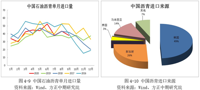 2020年以来,国内沥青进口仍然保持增长,1-10月份国内沥青进口量累积达到407.75万吨,同比增长13.44%,而出口量同比下滑23%。分地区来看,韩国、新加坡仍然是国内主要的沥青进口国,但2020年两国进口量占比较2019年有所下滑,马来西亚、泰国的进口量占比有所增长。2020 年国内沥青需求大幅增加,这也在一定程度上提升了沥青的进口需求,国内沥青进口量有望扭转前两年下降趋势,2020年全年进口量有望超过460万吨。