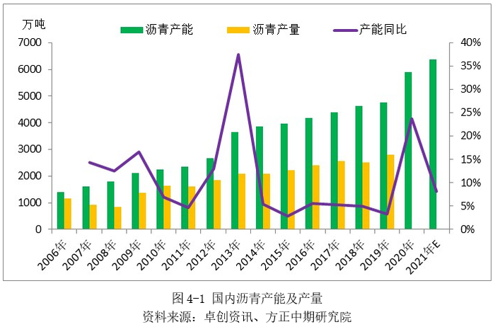 一、 国内沥青产能持续增长 2021年新增产能仍然较多