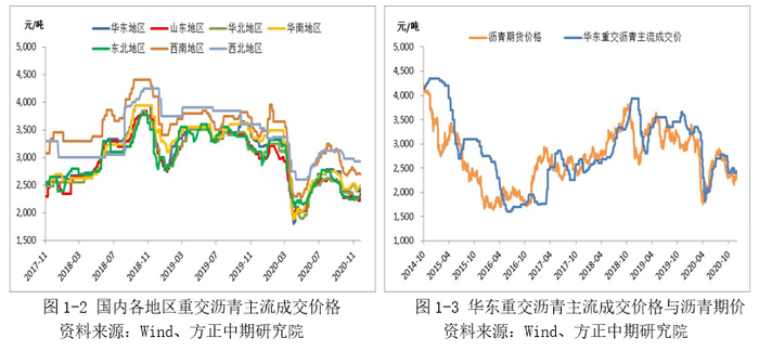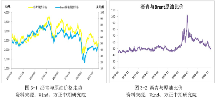 2020年沥青走势受成本端的影响仍然十分显著,尤其是上半年在疫情以及石油市场“价格战”影响下,原油持续下跌带动沥青下行,而5月份以后原油价格的企稳反弹也推动了沥青的上行,同时下半年受沥青市场高供给影响,沥青整体表现弱于原油。2020年1-4月份,受成本端下跌打压,沥青期价持续下跌,最低跌至1758元/吨,接近2016年初创下的历史低点;5-7月份,受成本端反弹带动,叠加国内疫情缓和后沥青现货需求逐步恢复,沥青期现价格同步上涨;8-12月份,成本端在9、10月份有所下跌,同时沥青市场高供给导致库存持续处于高位,沥青现货整体走弱也推动了期价的下行,沥青运行重心持续下移,最低跌至2110元/吨,跌幅达到28%,但11月份随着成本端上行,沥青价格也企稳反弹。