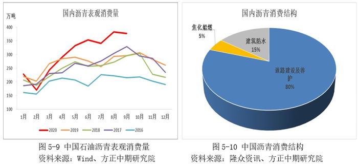受疫情及春节因素影响,2020年一季度沥青需求大幅萎缩,但随着国内疫情的缓解以及国家对基建的支持,二季度以后,在公路施工逐步启动的支持下,沥青需求持续恢复,但6月中下旬-8月份仍然受到南方降雨的影响,沥青刚性需求释放遇阻,9月中旬以后明显提升,但11月份后刚需再度走弱,整体季节性需求特点较为明显。资料显示,2020年1-9月份,沥青表观消费量同比增长14%,增幅超过往年同期水平。2020年是“十三五”的最后一年,下游需求集中爆发,加之炼厂高利润下生产沥青的积极性提高,带动沥青产量大幅增长。